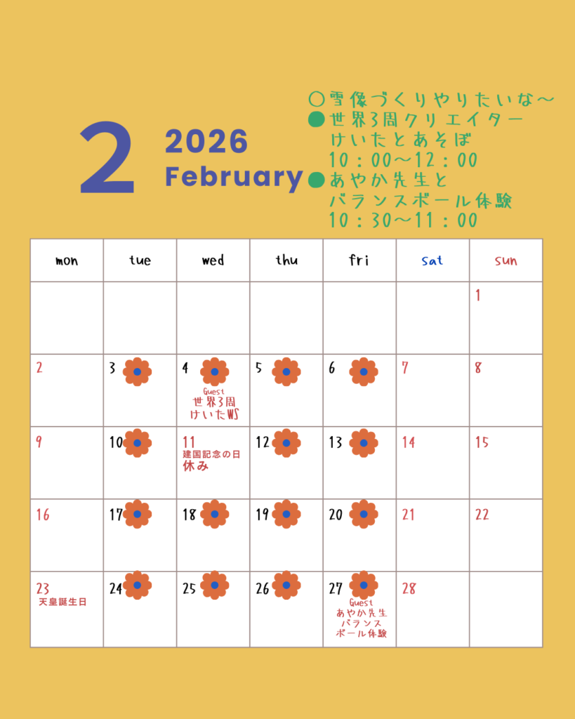 2026.02.15 🌱フリースクール「学びのかまくら」2月営業カレンダー🌱 まなびのかまくら 【学びのかまくらイベント】2月4日(水) 世界3周クリエイターけいたとあそぼ2月27日(金) あやか先生とバランスボール体験 お気軽に遊びにきてください🚗✨ 前の記事 次の記事